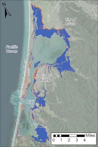 Wigi or Humboldt Bay with 0.5 meters of SLR (in blue – aprx 2060 interm scenario) and 1.0 meters of SLR (in orange – aprx 2000 interm scenario)