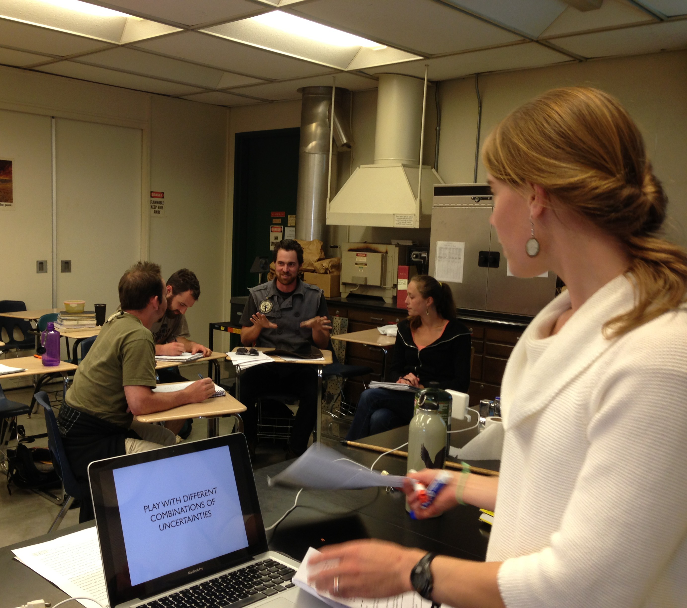 structured on the page and the way that it is actually practiced and utilized in the real-world. For this reason, I seek many opportunities to give students a real-world perspective on course topics. I invite a number of guest speakers to come to my classes and talk about the work they do and how it relates to the class. Here Jennifer Marlow, a visiting speaker from the Climate Justice Project Three Degrees Warmer and a founder of a planning initiative for the Alaska Native village of Kivalina called Re-Locate Kivalina, visits the coastal and marine planning class to teach students about a planning exercise called Scenario Planning.