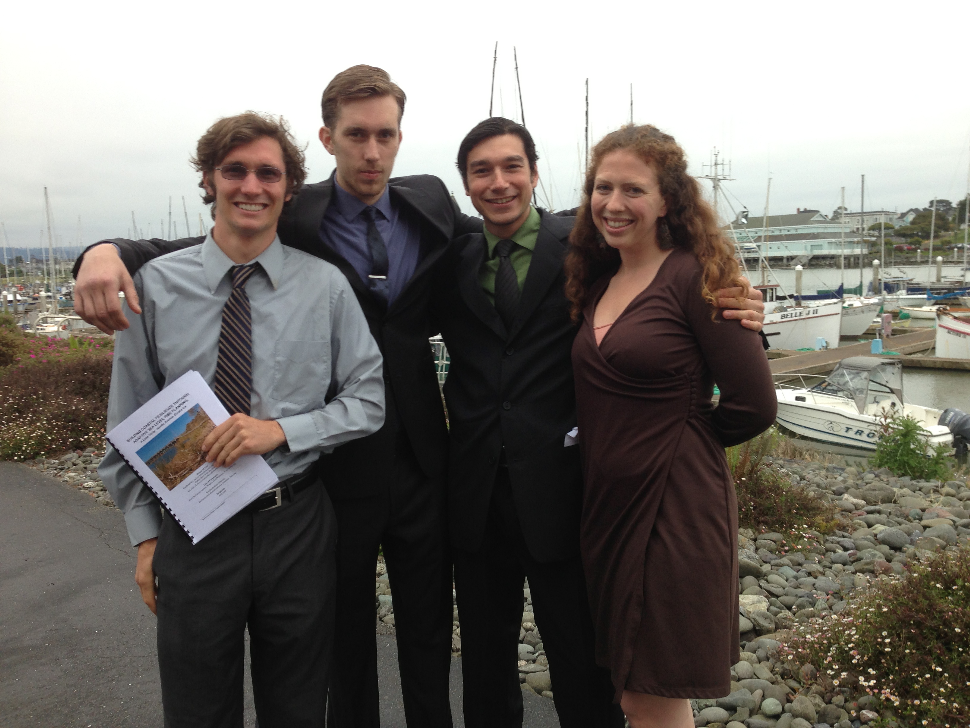 In the same class, students Evan Wisheropp, Andrew Nugent, Chris Weinstein, and Kerry McNamee (from left to right) worked on analysis of a parcel of property in Eureka, CA that is vulnerable to sea level rise. They also presented their findings to the Humboldt Bay Harbor District. Their project titled: Building Coastal Resilience Through Adaptive Sea Level Rise Planning: A Case Study of Jacobs Ave, Eureka, CA was eventually published in a peer-reviewed academic journal. found here